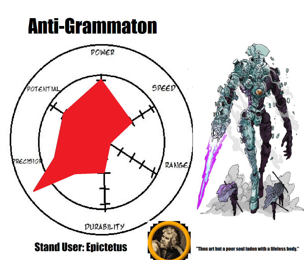it’s entirely possible either anti-grammaton or GITM win, depending on who can run their build best and who planned the furthest ahead and did it the best, as well as a very small amount of luck being involved. With the length it takes for either 2400 stand to kill the other, it’s entirely possible for anti-grammaton to leave a fight it doesn’t like, as can GITM. These two likely pursue each other for eternity, none quite safe in their own immortal quest to kill the other. The example 2400v2400 fight I gave took over 90 rounds and comes down to a single action. Anti-grammaton may not be a full counter to GITM, but it is an extremally worthy opponent where even a small slip spells doom on any powerscale between the two.
