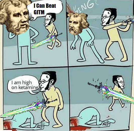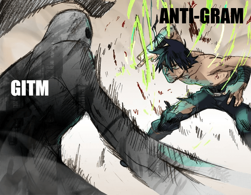 However, without anti-pasta tech, GITM is on the backfoot, its only long-lasting damage being ultra-EB [which would be at dis vs high AC] or fists. Poetically, GITM only kills anti-grammaton using one trick; the trick that allowed anti-grammaton to exist in the first place.