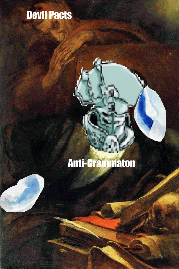 GITM has one more counter-move. If it makes armor out of anti-pasta bludgeoning type, and it can fit on its ghost form, it melds into the machine until it pops out of said machine, allowing it to move directly into the anti-grammaton’s space, hitting it with anti-pasta from the inside, and killing it in ghost form. [it could also just bring an anti-pasta dagger and attack from the inside, only using reactions to negate save-or-suck into convergent future from the anti-grammaton. Amazing that GITM wins by going “inside” another machine, that being anti-grammaton itself, and killing it from inside out using its own tech.