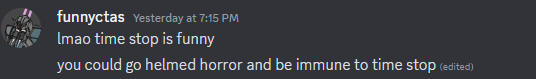 Using this and some spell programming, We can create a system that, upon the activation of a time stop spell, instantly wishes us immune to time stop. for this, we can create a helmed horror, and give it access to scrying on us at all times [Anything from force-shaped arcane eyes to simple scrying scrolls would theoretically work if you have enough], and access to a way to cast wish [Glyphs, Rings, Scrolls]. a magic mouth can be set to detect a time stop, which our Zodar can react to accordingly by casting wish immunity on us and up to 9 allies. We can set more than one of these to react to more than one time stop even, effectively making us immune to the end times; though the rest of the world still freezes forever until we can find a way to unstop time, and, unless we set them to cast in sequence to keep us immune, we only have 8 hours.